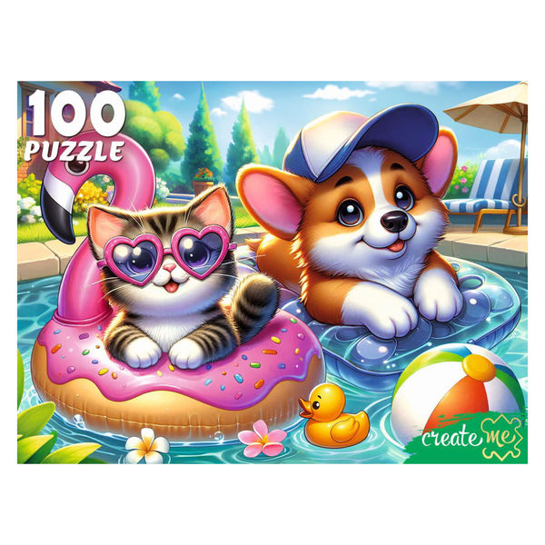Пазлы, 100 элементов, 165*225 мм, Котенок и щенок в бассейне, CreateMe, Рыжий кот