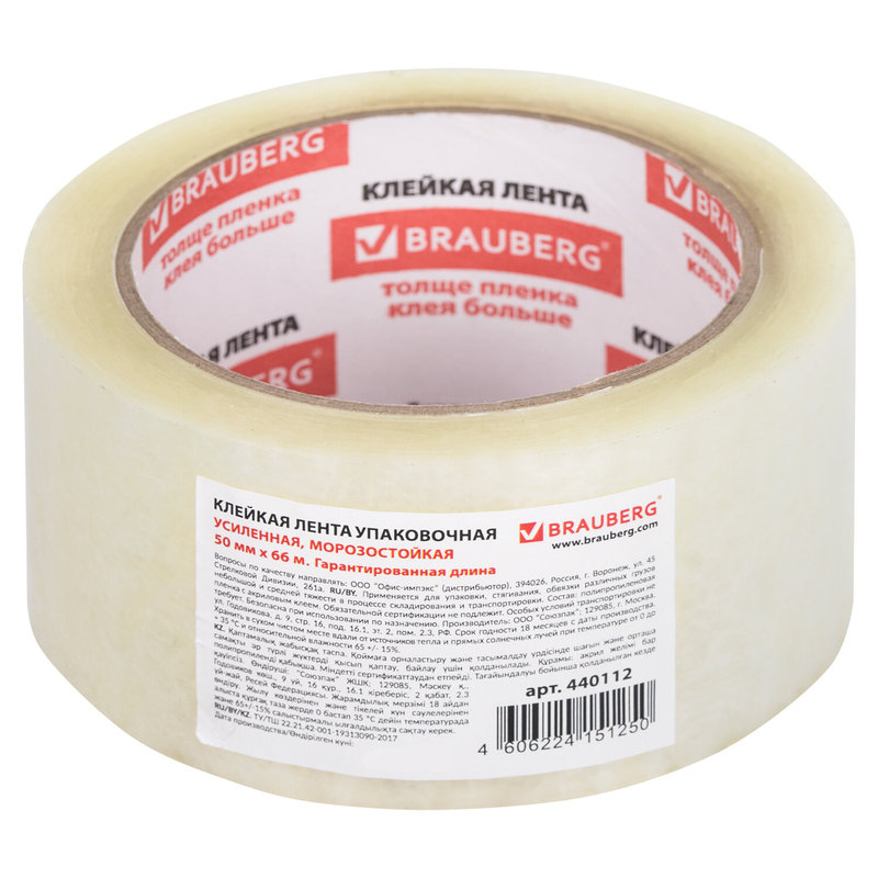 Упаковочная клейкая лента BRAUBERG активно используется в торговле, промышленности, быту и подходит для оперативной упаковки с помощью диспенсера или вручную. Отличается высокой адгезией клея (слипанием с поверхностью) и стойкостью к разрыву. Толщина скотча 45 мкм позволяет переносить воздействие низких температур и влажности и выдерживать вес коробки 15-17 кг. Клейкой ленты шириной 50 мм и длиной намотки 66 м хватит на продолжительное время. Цвет - прозрачный.
